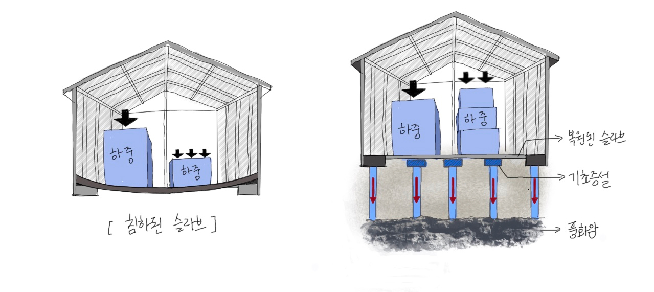 공장 슬래브를 인상하거나 보강하는 경우, 기초가 없는 건물 슬래브에 기초를 신설해야 하는 경우 등